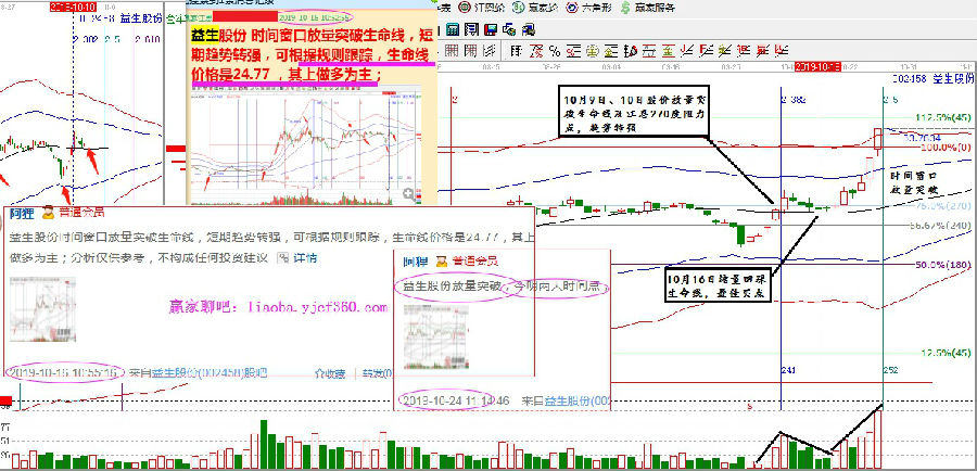 接下來(lái),我們講下個(gè)股的實(shí)戰(zhàn)案例,這個(gè)股票就是益生股份,該股是在江恩時(shí)間窗口10月9日、10日放量突破站穩(wěn)江恩270度及極反通道生命線的,趨勢(shì)轉(zhuǎn)強(qiáng),符合跟蹤操作規(guī)則。因此在10月16日股價(jià)縮量回踩生命線時(shí)做了詳細(xì)的圖形展示,股價(jià)隨后啟動(dòng)拉升,并在10月25日時(shí)間窗口繼續(xù)加速封板,短短一周的時(shí)間已經(jīng)從最佳買點(diǎn)生命線上漲到階段減持點(diǎn)紅色線,單波利潤(rùn)達(dá)到35%;如此巨大的上漲空間皆是因時(shí)間周期的精確預(yù)判而獲得。可見(jiàn),時(shí)間周期在個(gè)股分析交易中的巨大威力。