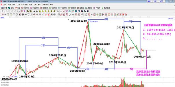 用一張老圖為例,講一下上證指數(shù),2013年6月28是1849低點,到2020年6月運行8年周期,會不會同樣也是一個低點,6124高點時間是2007年10月,5178高點為2015年6月。高點到高點之間運行了92個月。下一個高點的時間為,2023年2月。