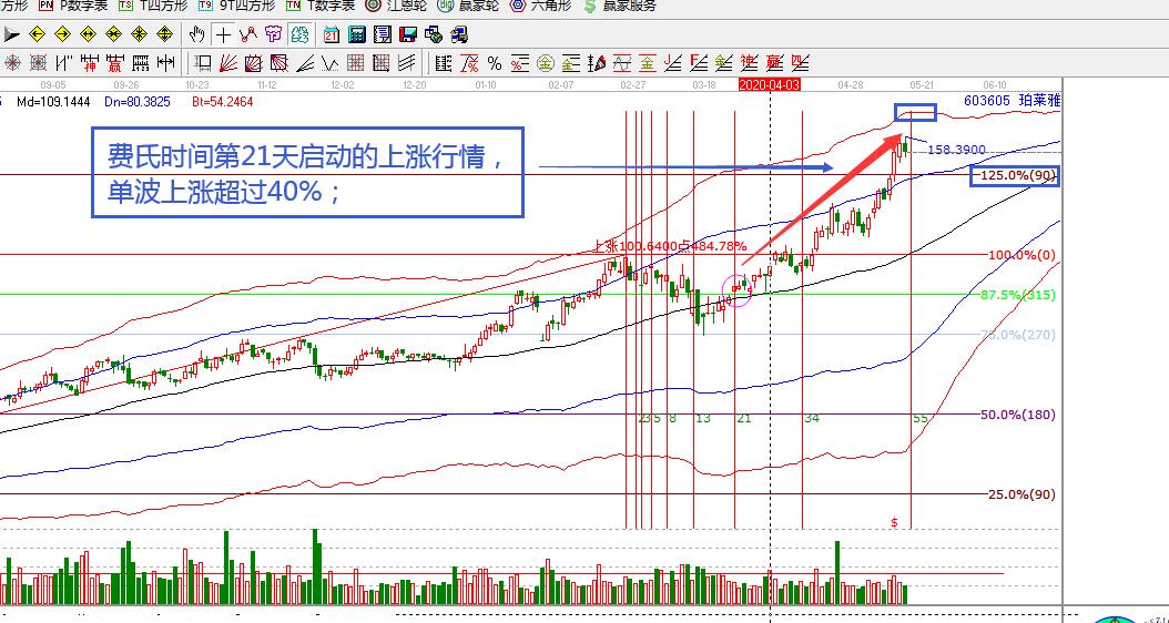 4月3日,股價處于生命線上強(qiáng)勢區(qū)域,趨勢上支持買入;價格處于江恩315度之上,支撐上符合買入條件,股價的上漲空間按照規(guī)則看高前期高點及藍(lán)色線。時間周期這塊,費氏時間第21天,股價上漲突破了315度,懂贏家的朋友應(yīng)該明白,這是一個強(qiáng)勢二買模型。事實上,股價在生命線和315度共振支撐上連續(xù)反彈,逐步創(chuàng)出了新高并突破了藍(lán)色線。