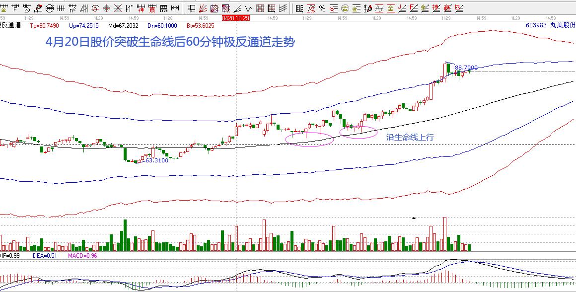 股價的上漲階段,筆者調(diào)整了價格分析圖,將波段百分比調(diào)整為波段百分比延伸線,同時,在震蕩階段所需關(guān)注的60分鐘級別極反通道走勢給大家做個展示,我們知道趨勢行情下60分鐘生命線是做趨勢跟蹤的關(guān)鍵位,因為強(qiáng)勢上漲階段股價不會跌破此位置,甚至跌破之后也可以快速收回。