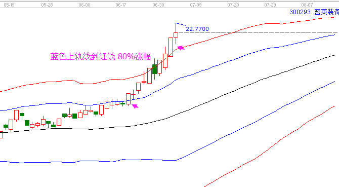 1、蘭英裝備6月12日突破藍(lán)色上軌線,目前創(chuàng)下新高,短短14個(gè)交易圖80%漲幅