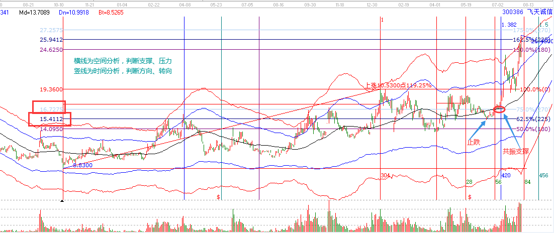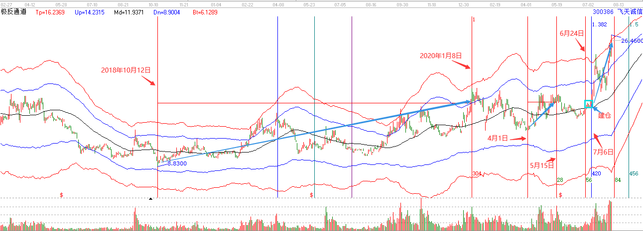 然后,我們通過空間分析工具(波段百分比延伸線+極反通道)同樣對(duì)2018年10月12日~2020年1月8日這段走勢(shì)進(jìn)行空間研究(2018年10月12日是低點(diǎn),2020年1月8日為高點(diǎn))。股價(jià)在220度也就是15.41的位置止跌,然后開始上攻,在6月24日站上極反通道的黑色生命線和270度的共振支撐位,也就是16.72的位置,共振支撐的支撐能力更強(qiáng)。隨后在幾天的支撐確認(rèn)之后在7月6日開始快速拉升。