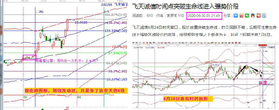 下面我們就通過時(shí)間和空間兩個(gè)方面來分析飛天誠信的買入點(diǎn)位。首先,我們通過時(shí)間分析工具(黃金時(shí)間周期線)來對(duì)2018年10月12日~2020年1月8日這段走勢(shì)進(jìn)行研究,發(fā)現(xiàn)其在藍(lán)色豎線的位置發(fā)生了趨勢(shì)變化,那么在未來同樣7月6日藍(lán)線的位置會(huì)不會(huì)變化呢?其走勢(shì)證明在藍(lán)線的位置,股價(jià)開始了快速拉升階段。然后在通過時(shí)間分析工具(等距時(shí)間周期線)來對(duì)2020年4月1日~2020年5月15日這段走勢(shì)進(jìn)行研究,發(fā)現(xiàn)其在6月24日也是一個(gè)時(shí)間窗口。而在這一天股價(jià)站上了極反通道的黑色生命線這個(gè)重要支撐位置,隨后幾天在對(duì)支撐進(jìn)行確認(rèn)之后,在前面提到7月6日藍(lán)線的位置開始了快速拉升。