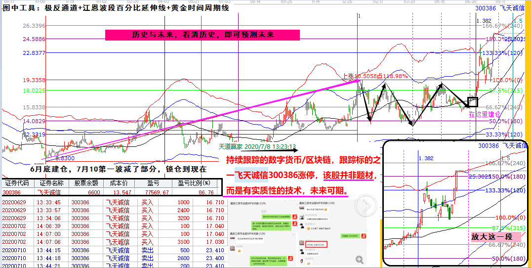 回顧總結(jié)學(xué)習(xí)該股的選出依據(jù)及操作信號(hào),歷史前一波的上漲作為起始因子,那么未來的走勢(shì)江恩時(shí)空線幫你提前顯現(xiàn)!遵循江恩所言,精進(jìn)研究歷史,即可掌控未來!飛天誠信同步6月底建倉,7月10日第一波高點(diǎn)減倉,剩下的鎖倉至今,單只個(gè)股利潤逼近8萬元,盈利超80%,這就是波段交易的魅力,你看懂了嗎?