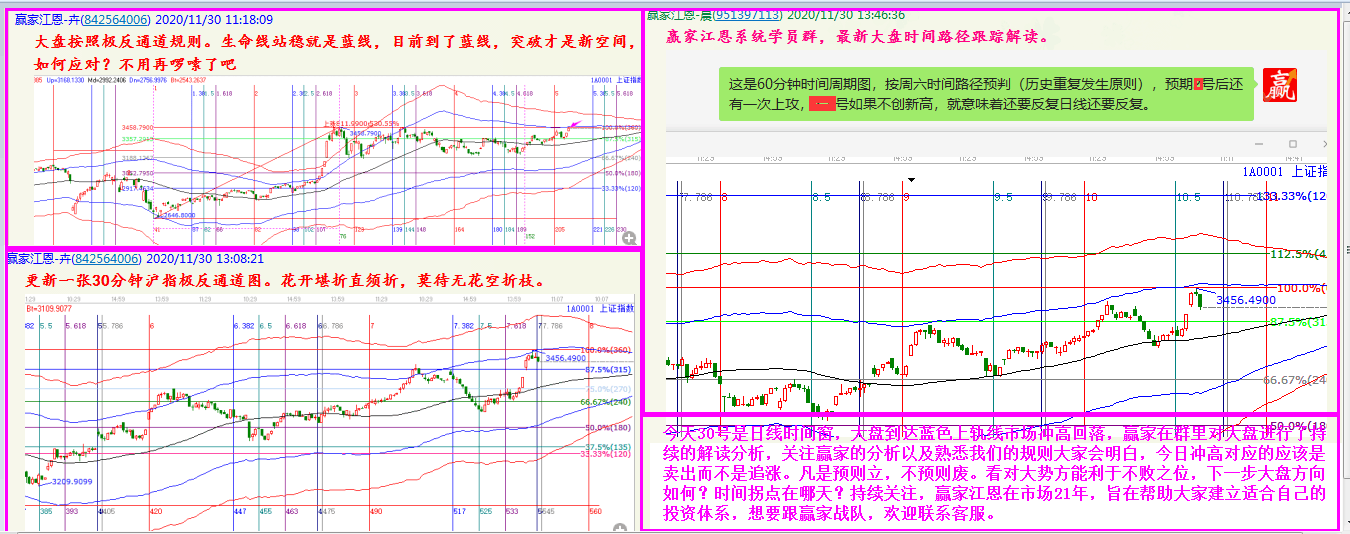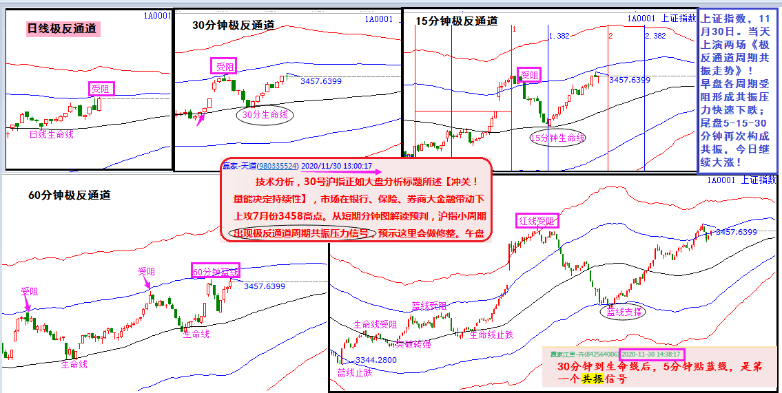 對(duì)照上證指數(shù)日線及日內(nèi)各周期的極反通道匯總圖,11月30日早盤強(qiáng)勢(shì)上攻,各周期全部受阻形成共振賣點(diǎn)——快速下跌;尾盤指數(shù)5-15-30分鐘均回落到支撐線構(gòu)成共振低吸信號(hào),實(shí)則,今日大陽報(bào)收!連續(xù)兩場(chǎng)《極反通道周期共振信號(hào)的標(biāo)準(zhǔn)走勢(shì)》,感受到市場(chǎng)的神奇魅力了嗎?