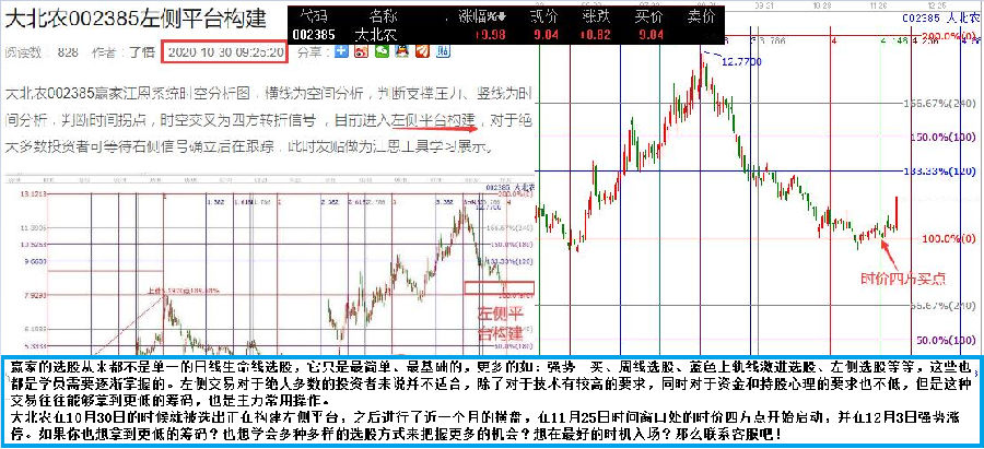 大北農(nóng)在10月30日的時(shí)候就被選出正在構(gòu)建左側(cè)平臺(tái),之后進(jìn)行了近一個(gè)月的橫盤,在11月25日時(shí)間窗口處的時(shí)價(jià)四方點(diǎn)開始啟動(dòng),并在12月3日強(qiáng)勢(shì)漲停。