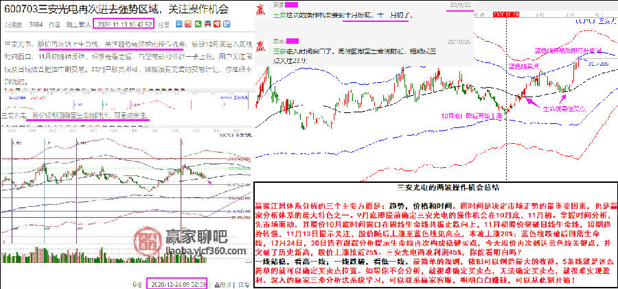 贏家江恩體系分析的三個(gè)主要方面是:趨勢(shì),價(jià)格和時(shí)間。而時(shí)間是決定市場(chǎng)走勢(shì)的最重要因素,也是贏家分析體系的最大特色之一。9月底即提前確定三安光電的操作機(jī)會(huì)在10月底,11月初。掌握時(shí)間分析,先市場(chǎng)而動(dòng)。其股價(jià)10月底時(shí)間窗口在周線生命線共振止跌向上,11月初股價(jià)突破日線生命線,短期趨勢(shì)轉(zhuǎn)強(qiáng),11月13日提示關(guān)注,股價(jià)隨后上漲至藍(lán)色線見(jiàn)高點(diǎn),本波上漲20%;藍(lán)色線跌破后回落生命線,12月24日,30日皆有跟蹤分析提示生命線再次構(gòu)成穩(wěn)健買(mǎi)點(diǎn),今天股價(jià)再次到達(dá)藍(lán)色線關(guān)鍵點(diǎn),并突破了歷史新高,股價(jià)上漲接近25%。三安光電兩波利潤(rùn)45%,你能看明白嗎?