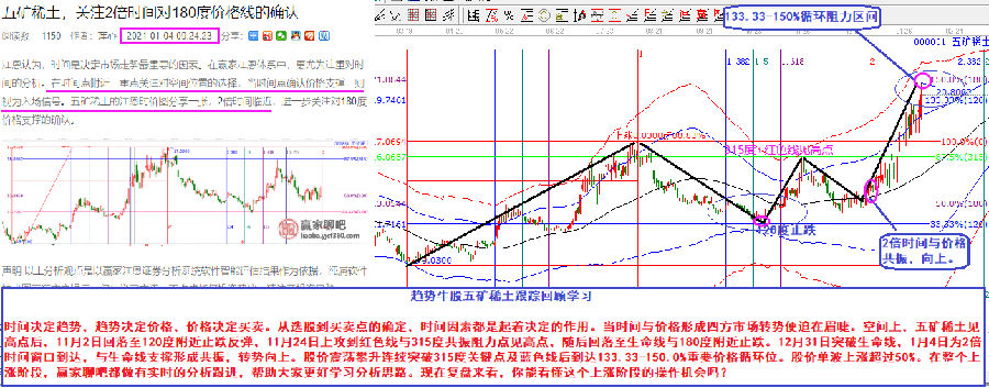 時間決定趨勢,趨勢決定價格,價格決定買賣。從選股到買賣點的確定,時間因素都是起著決定的作用。當時間與價格形成四方市場轉(zhuǎn)勢便迫在眉睫??臻g上,五礦稀土見高點后,11月2日回落至120度附近止跌反彈,11月24日上攻到紅色線與315度共振阻力點見高點,隨后回落至生命線與180度附近止跌。12月31日突破生命線,1月4日為2倍時間窗口到達,與生命線支撐形成共振,轉(zhuǎn)勢向上。股價震蕩攀升連續(xù)突破315度關鍵點及藍色線后到達133.33-150.0%重要價格循環(huán)位。股價單波上漲超過50%。在整個上漲階段,贏家聊吧都做有實時的分析跟進,幫助大家更好學習分析思路?,F(xiàn)在復盤來看,你能看懂這個上漲階段的操作機會嗎?