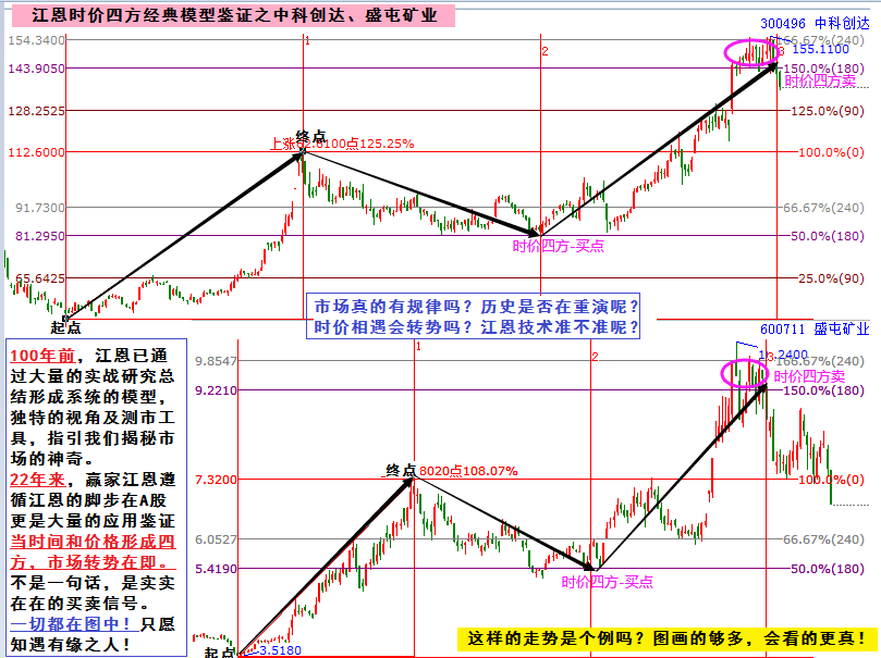 100年前,江恩已通過大量的實戰(zhàn)研究總結(jié)形成系統(tǒng)的模型,獨特的視角及測市工具帶著我們揭秘市場神奇。20年來,贏家江恩遵循江恩的腳步繼續(xù)去在A股更是大量的應用鑒證。“當時間和價格形成四方,市場轉(zhuǎn)勢在即”。這不是一句話,是實實在在的買賣信號。想表達的都在圖中,只愿知遇有緣之人。