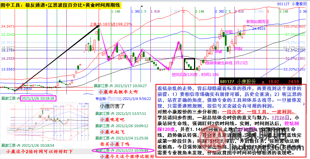 1月26日,小康站回生命線,強(qiáng)調(diào)盯好2倍時(shí)間線。實(shí)則,時(shí)間到達(dá)后,挖坑回踩120度,并在1.146時(shí)間確認(rèn)止跌;2月23日,以漲停突破生命線,趨勢確認(rèn)轉(zhuǎn)強(qiáng),符合重點(diǎn)跟進(jìn)規(guī)則。實(shí)則,一波上攻到藍(lán)線完成第一階段任務(wù);回踩3分位支撐后,開啟新任務(wù),按照波動(dòng)法則看新高。今日強(qiáng)勢漲停創(chuàng)出新高,站上藍(lán)線打開新空間。市場的美需要專業(yè)視角來發(fā)現(xiàn),仔細(xì)欣賞圖中時(shí)間和價(jià)格相遇的表現(xiàn)吧。