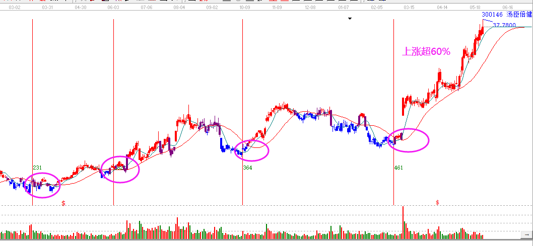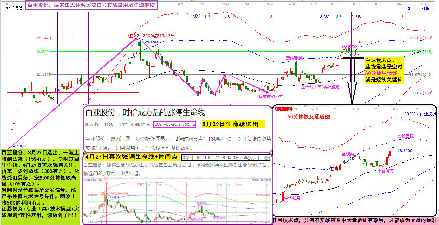 百亞股份,3月29日選出,一波上攻到藍(lán)線(15%有之),受阻跌回生命線;4月29日再次強(qiáng)調(diào)關(guān)注,再來一波到藍(lán)線(30%有之)。藍(lán)線受阻震蕩,按照60分鐘低吸高拋(10%有之)。對(duì)照?qǐng)D形仔細(xì)揣摩交易信號(hào),能嚴(yán)格按照技術(shù)信號(hào)操作,兩波上攻50%的利潤(rùn)有之。江恩視角+專業(yè)工具+技術(shù)模型+實(shí)戰(zhàn)規(guī)則=理性獲利。
