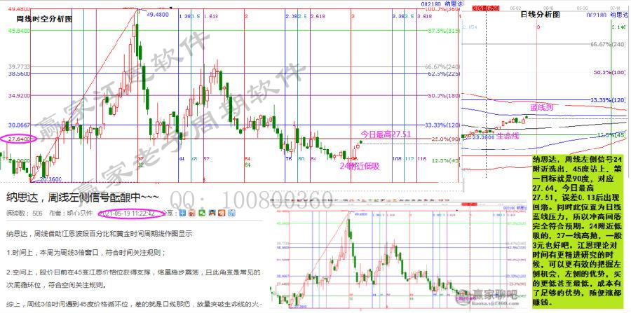 納思達,周線左側信號24附近選出,45度站上,第一目標就是90度,對應點位27.64,今日最高27.51,誤差0.13后出現(xiàn)回落。同時此位置為日線藍線壓力,所以沖高回落完全符合預期。24附近低吸的,27一線高拋,一股3元也不錯。江恩理論對時間有更精進研究的時候,可以更有效的把握左側機會,左側的優(yōu)勢,買的更低甚至最低,成本有了足夠的優(yōu)勢,隨便漲都賺錢。