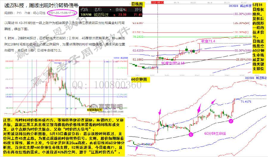 對照誠邁科技的分析圖看,5月13日盤前分析:顯示該股時間躍過,且空間上在45度止跌,為重點跟蹤的時價轉勢信號。實則,股價如期踩著45度支撐線,展開上攻,今日更是迎來20cm高度。再看日線和60分鐘分析圖,百分比支撐+60分鐘生命線支撐,52附近進場,今日最高71,且仍有再攻紅線的需求,小波段近40%的空間,源于“江恩時價四方”。