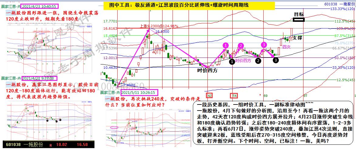 一拖股份,4月下旬做好的分析圖,沿用至今!再看一拖這兩個月的走勢,42天在120度構成時價四方展開拉升;4月23日漲停突破生命線和180度確認趨勢轉強;之后在180-240度箱體間有序震蕩,1-2-3多么標準;再看6月7日,漲停姿勢突破240度,疊加江恩4次法則,直接突破迎來2板,藍線受阻后在270-315度空間修整,今日再度逆勢封板,打開新空間。下個時間、空間,已標注!一拖,美嗎?