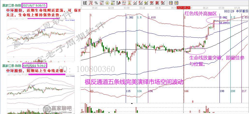 5月21日時(shí)間窗口開始關(guān)注中環(huán)股份,當(dāng)日,生命線跌破后,5月31日再次放量突破,回踩不破,構(gòu)成最佳生命線技術(shù)買點(diǎn)。隨后開啟拉升階段。今天再次放量大漲,股價(jià)突破紅色線,生命線啟動(dòng)后累計(jì)上漲超過40%;紅色線外高風(fēng)險(xiǎn)區(qū),保持謹(jǐn)慎。從買到賣,從生命線到紅色線,交易信號(hào)明確。極反通道完美把握市場(chǎng)的空間波動(dòng)。按照買賣信號(hào)交易,做理性投資。