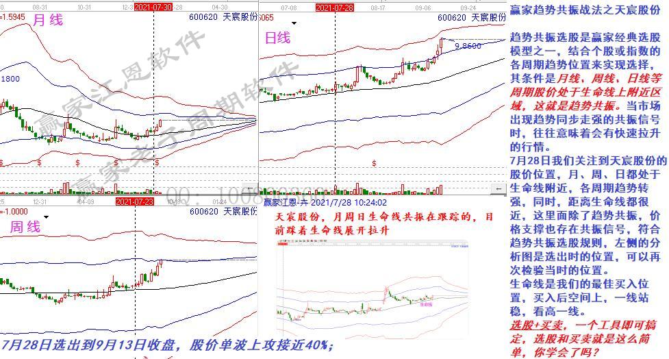 7月28日我們關注到天宸股份的股價位置,月、周、日都處于生命線附近,各周期趨勢轉強,同時,距離生命線都很近,這里面除了趨勢共振,價格支撐也存在共振信號,符合趨勢共振選股規(guī)則,左側的分析圖是選出時的位置,可以再次檢驗當時的位置?! ?/p>