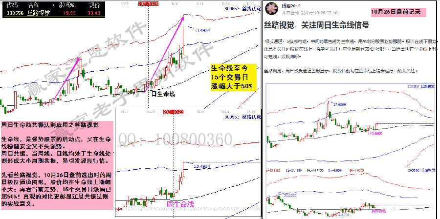 先看絲路視覺,10月26日盤前選出時的周日極反通道圖形,股價均在生命線上漲幅不大;再看當(dāng)前走勢,15個交易日漲幅已超50%!直觀的對比更彰顯江恩共振法則的實戰(zhàn)意義。