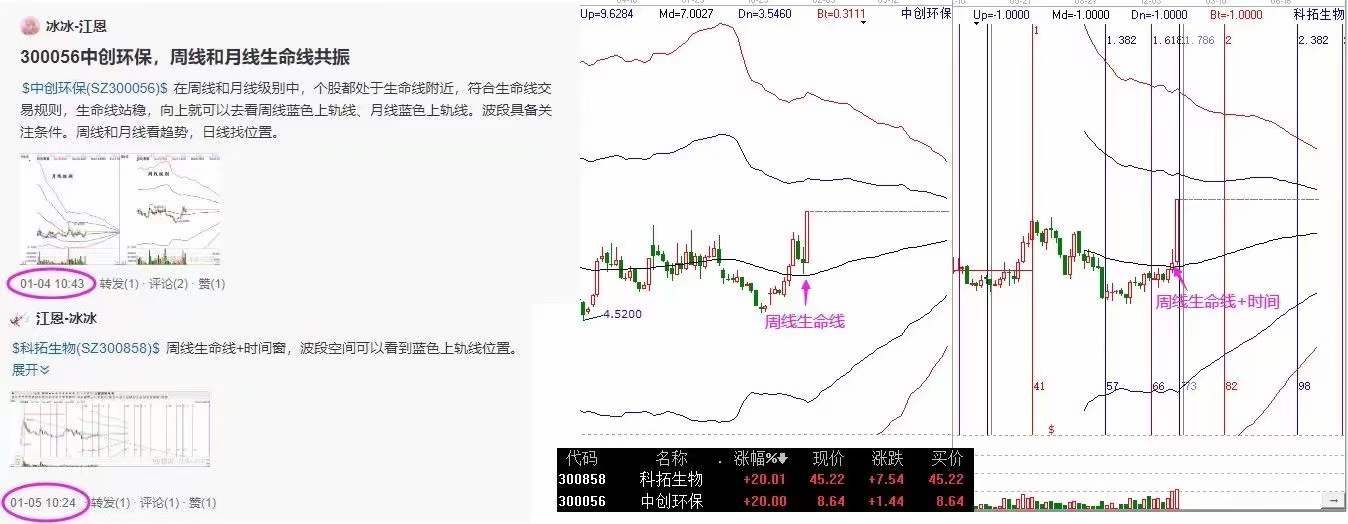 當股價月線,周線,都處于生命線附近的時候,同時,日線也處于生命線附近,這就形成了長期,中期,短期的趨勢共振,這就是一個非常好的建倉買入信號。據(jù)此篩選出的中創(chuàng)環(huán)保、科拓生物,今天雙雙20c封板漲停。我們無法決定市場會怎么走,能做的只有提升自己的理解,在符合操作的買點買入,在符合賣出的信號賣出,僅此而已,江恩理論體系,幫助大家提前做市場預(yù)判,并利用江恩規(guī)則去進行跟隨。這就足矣。