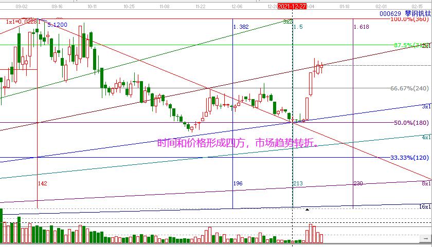 12月27日時間窗口,股價到達180度分割位支撐,時間+價格,形成四方,市場轉(zhuǎn)勢迫在眉睫,這是一個標準的時價四方信號,可借鑒學(xué)習(xí)。