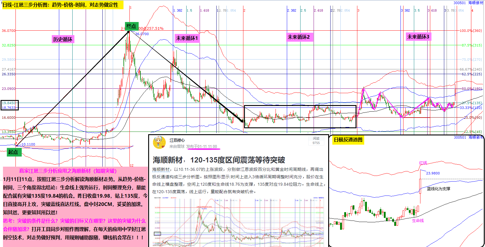 1月11日11點(diǎn),按照江恩三步分析解讀海順新材走勢。從趨勢-價(jià)格-時(shí)間,三個(gè)角度得出結(jié)論:生命線上強(qiáng)勢運(yùn)行,時(shí)間整理充分,量能配合就有突破135度19.84的機(jī)會(huì)。昨日收盤19.98,站上135度,今日直接高開上攻,突破藍(lán)線直達(dá)紅線。盤中封20CM,妥妥的加速。