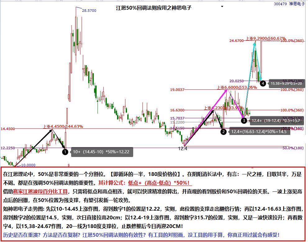 如神思電子走勢圖: 先以10-14.45上漲作圖,得到數(shù)字1的位置是12.22,實(shí)則,此位置的支撐走出翻倍行情;再以12.4-16.63上漲作圖,得到數(shù)字2的位置是14.5,實(shí)則,次日直接拉高20cm;以12.4-19上漲作圖,得到數(shù)字315.7的位置,實(shí)則,又是一波快速拉升;再看數(shù)字4,以15,38-24.67作圖,20一線為180度支撐位,止跌修整后今日再迎20CM!