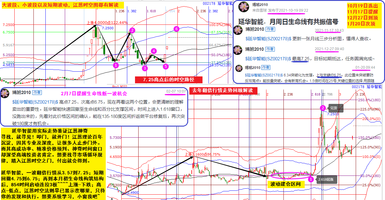 延華智能,一波翻倍行情從3.57到7.25;短期回撤4.75到6.75;再到本月初生命線構(gòu)筑結(jié)構(gòu)后,854時(shí)間啟動(dòng)連拉3板~~~~上漲-下跌;高點(diǎn)-低點(diǎn),江恩時(shí)空法則早已顯示在哪里,只待你的發(fā)現(xiàn)和執(zhí)行。