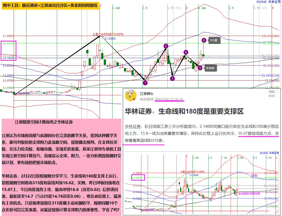 華林證券,2月22日按照規(guī)則分享學(xué)習(xí),生命線和180度支撐上運(yùn)行,按照規(guī)則空間看高315度和藍(lán)線對(duì)應(yīng)16.62。實(shí)則,昨日沖板回落收在15.07上,今日再度強(qiáng)勢(shì)上攻,最高沖到16.6(誤差0.02)后快速回落,最低探至14.7(與225度14.76誤差0.06),收在此位置上,就還有上攻機(jī)會(huì)。只是如果提前在315度做主動(dòng)高拋防守,規(guī)避回撤10個(gè)點(diǎn)差價(jià)可以完美落袋。這就是提前計(jì)算支撐阻力的重要性,學(xué)會(huì)了嗎?