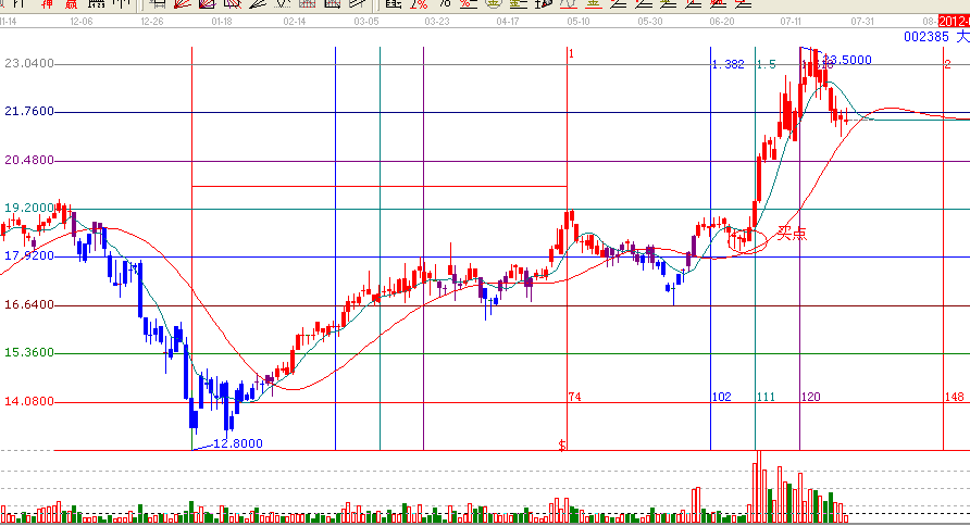 第一:依據(jù)贏家江恩分析系統(tǒng)趨勢工具乾坤k線顯示:002385,此票在6月29日放量突破乾坤k線綠色關(guān)注線,(依據(jù)贏家乾坤k線操作規(guī)則,k線上穿關(guān)注線可關(guān)注介入)