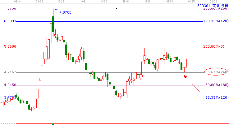 *:價(jià)格分析:江恩價(jià)格百分比:1月14日在價(jià)格百分比的240位置獲得支撐,我們可以看一下歷史的重要的高點(diǎn),低點(diǎn)是不是都在這些重要的線上邊,(這個(gè)工具以起點(diǎn)的點(diǎn)位或者價(jià)格,按照百分比向上或者向下延伸,從而預(yù)測(cè)指數(shù)和股價(jià)的上升或者下降空間,使用的方法:選種一個(gè)重要的高點(diǎn)位,或者重要的低點(diǎn),向上或者向下拖動(dòng)鼠標(biāo),這樣圖就做好了。)