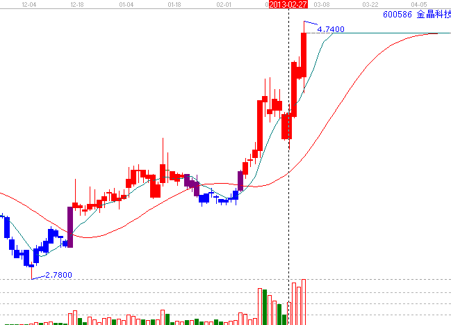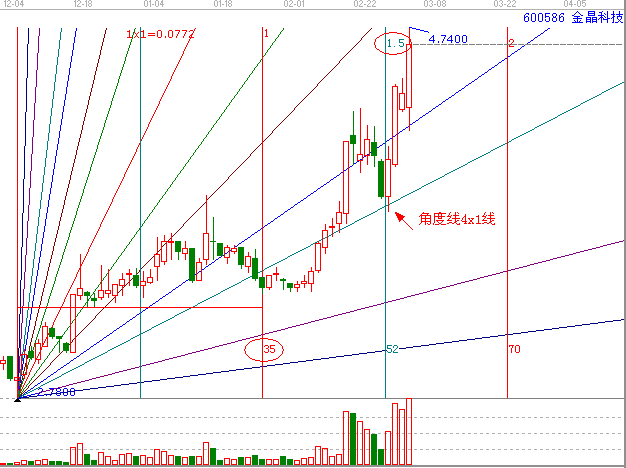 角度線:2月27日在4x1線處止跌獲得支撐,之后一路強(qiáng)勢上沖,(角度線是江恩理論的核心,當(dāng)你一但完全掌握了角度線,你將能解決任何問題,并決定任何股票的趨勢,)