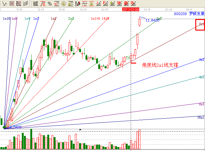 二:價(jià)格分析:角度線分析:600209,2013年3月4日震蕩回落江恩角度線的2x1線附近獲得支撐,(角度線,江恩理論的核心之一,當(dāng)你一單完全掌握了角度線,你將可以解決任何問題,并決定任何股票的趨勢(shì),)