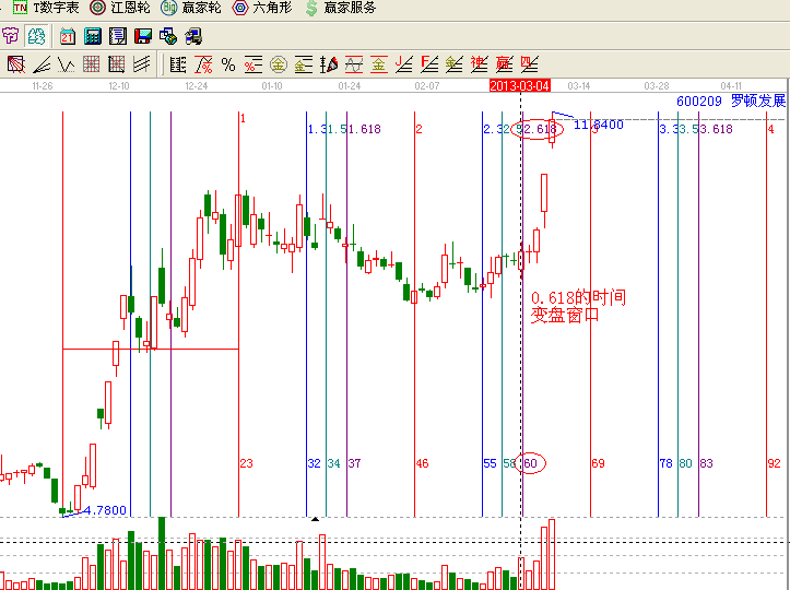 三:時(shí)間分析:黃金時(shí)間周期線:600209.2013.3.4日這一天是第二個(gè)循環(huán)的 0.618的位置,(黃金時(shí)間周期的起始點(diǎn),起點(diǎn)12年11月8日的低點(diǎn),12年12月31日高點(diǎn),黃金時(shí)間周期的使用方法就是,選擇歷史上重要的低高點(diǎn),高低點(diǎn),低低點(diǎn)的連線,重要的變盤時(shí)間點(diǎn)位0.382,0.5,0.618)