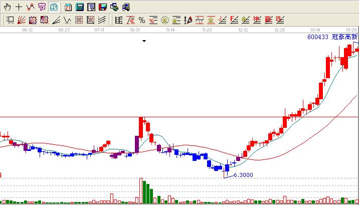 反觀歷史我們會(huì)發(fā)現(xiàn)蛛絲馬跡:600433在2012-11-01日放量后9.00一路跌倒6.30位置然后開始了10連陽(yáng)。這個(gè)也有人叫做十全十美,一般會(huì)走出一波行情,那么600433在走出十全十美之后一直是馬不停蹄緩緩上行,在其2012-12-27日很小的量過了9.00附近的高點(diǎn)創(chuàng)出了歷史新高,這個(gè)位置沒有停留多久就再一次新高基本是3天5天一個(gè)新高也不理會(huì)大盤,就那樣一直橫行無阻的新高著。很多人都發(fā)現(xiàn)了這個(gè)股票不錯(cuò),但是都是啃一口就走掉了,就這樣一直看著他新高。江恩的話在這個(gè)案例中再一次發(fā)揮的淋漓盡致。也充分的說明了江恩理論在其實(shí)戰(zhàn)中的一個(gè)地位,就看你是如何理會(huì)江恩理論了。