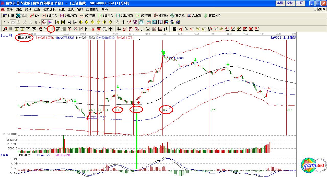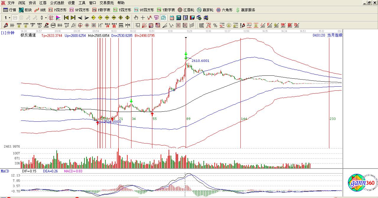 股指期貨在2013-03-15日9.55分見底2504.00遇到極反通道下軌位置,按照江恩規(guī)則上一次2013-14日09.15分低點2505.2點附近是一個絕佳的買點。這個買點也符合贏家極反通道的絕佳位置買點介入之后就開起了一波5分鐘的連續(xù)拉升,剛好是5時間周期,回調(diào)到8沒有止跌信號,在13時間窗口震蕩盤整后開啟了一波快速上行直接過21時間更為神奇的是股指期貨在22時間調(diào)整稍作休息后再一次創(chuàng)出新高這里距離34時間很近,而指標(biāo)macd給出背離的信號賣出按照江恩法則,一波快速上行后在新高力度時間將發(fā)生轉(zhuǎn)折。在其34時間快速殺跌殺跌到55時間窗口,這里1分鐘指標(biāo)再一次底背離發(fā)出買的信號,時間也到,極反通道生命線也到,前期的時間高低點超級符合,這樣就預(yù)示著一波大的行情即將來臨,隨之的是指標(biāo)macd在0軸金叉也更充分的說明了這一點。連續(xù)的陽線也更加肯定了這個推斷,直接看下一個時間89時間,這里距離上午收盤時間也是極反通道紅色外軌道線的壓力量能出現(xiàn)3次背離,預(yù)示著行情的一個反轉(zhuǎn)隨之而來的就是一波緩慢下跌行情。而這些完全可以用江恩理論去解釋這一切,如果不明白就把江恩華爾街45年多看2遍。那么你就會知道為什么2504.00附近是一個很安全的買點了