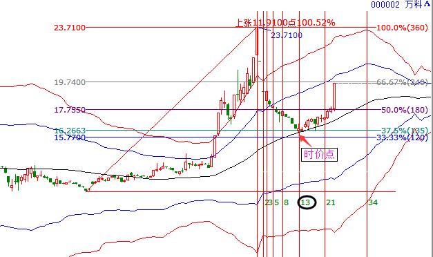 2.工具解析:該股開盤后,從藍(lán)色線破位,一直調(diào)整到生命線附近,嚴(yán)格按照破位一線,回調(diào)一線的規(guī)則。市場在經(jīng)過13個交易日回踩到極反通道生命線附近,可以發(fā)現(xiàn)的是,市場在整個回落過程中是縮量的。因此,生命線附近是可以介入,同時觀察價格工具,可以發(fā)現(xiàn)市場調(diào)整幅度很大,幾乎連續(xù)直接破位240度、180度。我們知道一般調(diào)整120度附近差不多是極限了,所以,價格上也有買點(diǎn),那么結(jié)合極反通道,價格工具,及時間工具,7月20日都是一個短期的介入點(diǎn)。