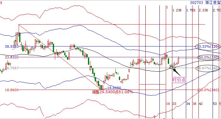 2.工具解析:先看極反通道,市場在6月23日,漲停突破生命線,其后回踩后繼續(xù)拉升,再次到達(dá)藍(lán)色線后回落,目前再次調(diào)整到生命線附近,整個(gè)波動符合極反通道的“一線站穩(wěn),看高一線;一線過不去,回調(diào)一線”的操作規(guī)則。同時(shí)結(jié)合價(jià)格工具可以發(fā)現(xiàn)市場的趨勢強(qiáng)勢,同時(shí),6月24日生命線與價(jià)格工具的240度形成了價(jià)格上的共振,構(gòu)成了一個(gè)階段的買點(diǎn);而在8月4日時(shí)間窗口附近,市場再次回落到生命線與240度支撐共振位,時(shí)間與價(jià)格形成共振,價(jià)格與價(jià)格形成共振,因此在8月4日前后,是該股的最佳買入位置,其短期的壓力位則是180度位置的33.63附近,突破看高到藍(lán)色線附近。