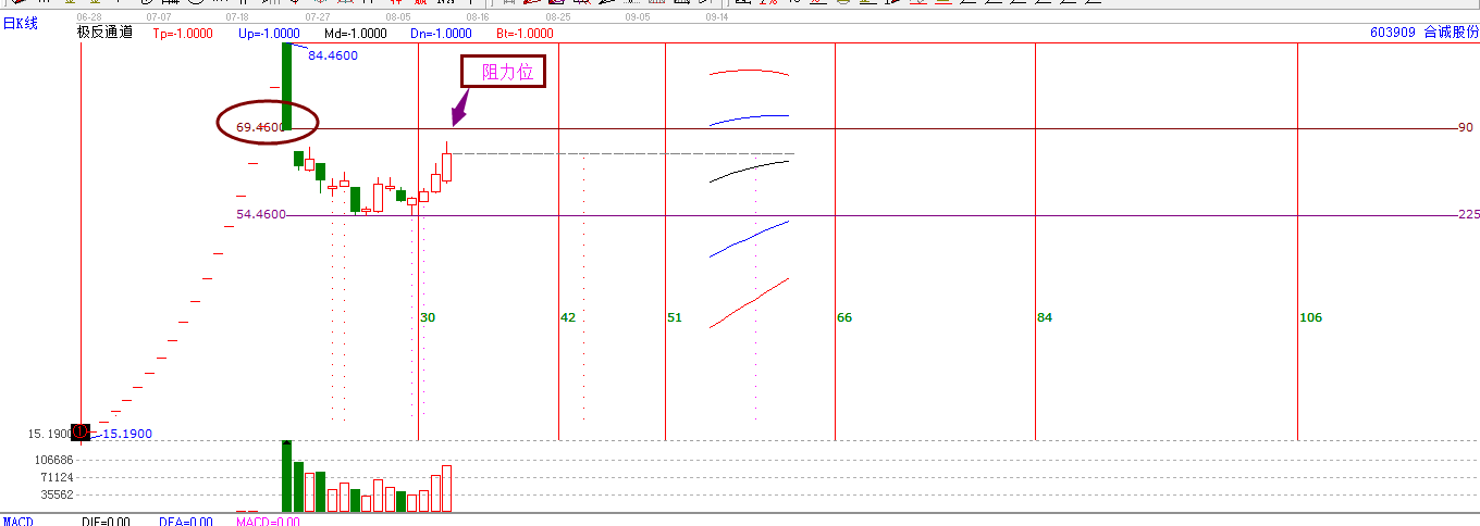 2.作圖如下:以6月29日上市的第一天為起點(diǎn),利用螺旋歷法時(shí)間循環(huán)線以及輪中輪變盤(pán)點(diǎn)兩個(gè)工具,分析時(shí)間窗。再以7月22日的高點(diǎn)為起點(diǎn),畫(huà)K線價(jià)格四方形,設(shè)定步長(zhǎng)為5,保留225度的支撐位。然后右鍵調(diào)出極反通道,得到下面的圖形。