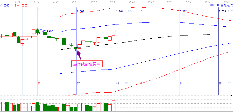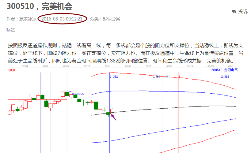 2.個(gè)股圖形解析:在江恩理論中我們注重共振,當(dāng)極反通道生命線和時(shí)間窗形成了共振,則就是完美的操作機(jī)會(huì)。因?yàn)樵?月3日,贏家聊吧依據(jù)生命線和時(shí)間的共振,選擇300510操作。