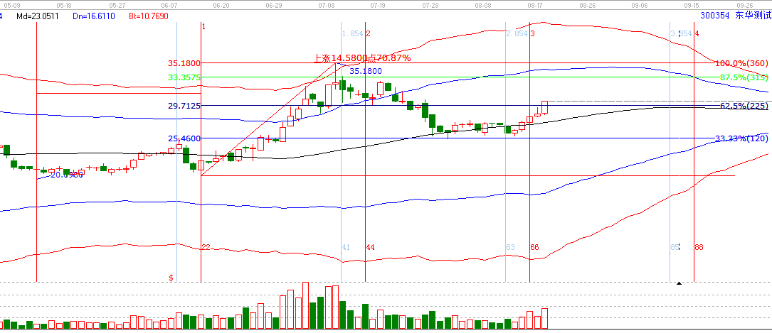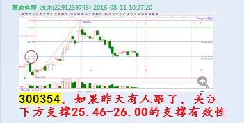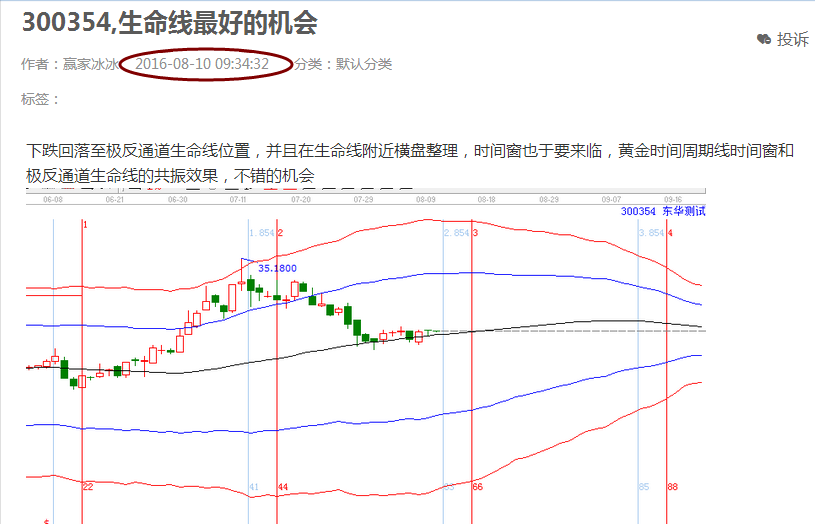 2.江恩工具分析共振:贏家聊吧在8月10日發(fā)布300354相關(guān)分析貼。時間窗和極反通道生命線形成共振。形成了操作的條件,然后回調(diào)了兩天時間,在群里有跟蹤分析,關(guān)注25.46的支撐有效性,經(jīng)過調(diào)整確認(rèn),回踩在支撐位止跌,正是開始上漲。