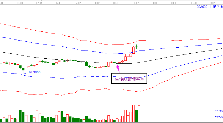 2.在極反通道操作規(guī)則中,生命線將個股分為強勢和弱勢兩個區(qū)域,當個股處于極反通道生命線上,則為強勢,當個股處于極反通道生命線下,則個股處于弱勢區(qū)域。強勢區(qū)域個股操作機會多,股性活躍,盈利空間大。而生命線下個股則走勢偏弱,股性也慢,操作風險偏大。因為極反通道就是一個個股能否操作的判斷性工具。也因為簡單直觀,所以能幫使用者更快速的判斷市場,判斷個股,并得出結(jié)論。極反通道的五條線均可以是個股的阻力位支撐位,站穩(wěn)為支撐,破位為阻力。按照江恩的講解,買在支撐位,賣在阻力位,因此,當個股突破站穩(wěn)生命線的時候,趨勢剛剛轉(zhuǎn)變,可以看作新的行情的啟動點,生命線就是最佳的買點位置,所以在8月9日個股再次突破并回踩生命線的時候,就形成了新的機會,開始操作。