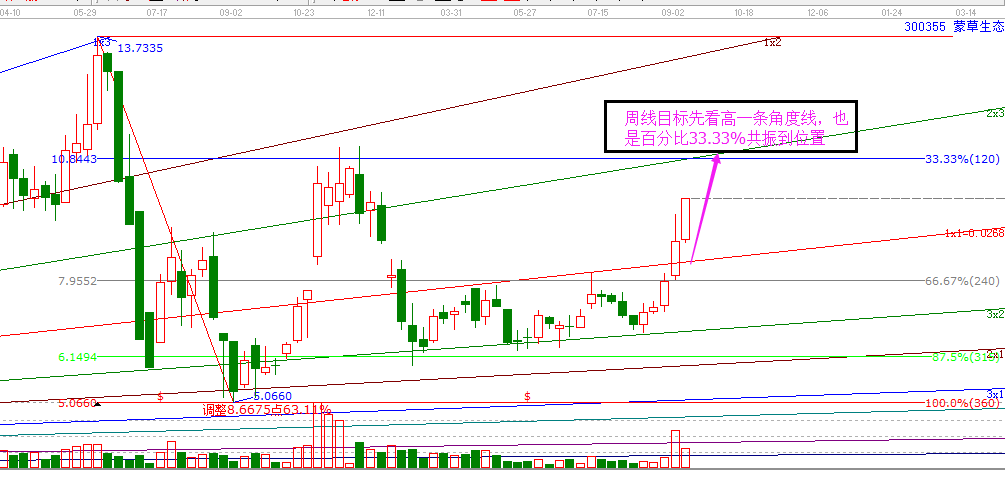 再看當(dāng)前的周線圖形。利用角度線和波段百分比,可以看到在突破角度線1*1線之后,目標(biāo)位就是上方的2*3線,同時(shí)也是波段百分比33.33%共振的位置,即10.85附近,可以繼續(xù)放心持股,等待目標(biāo)位到達(dá)。