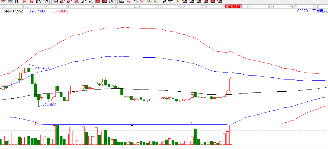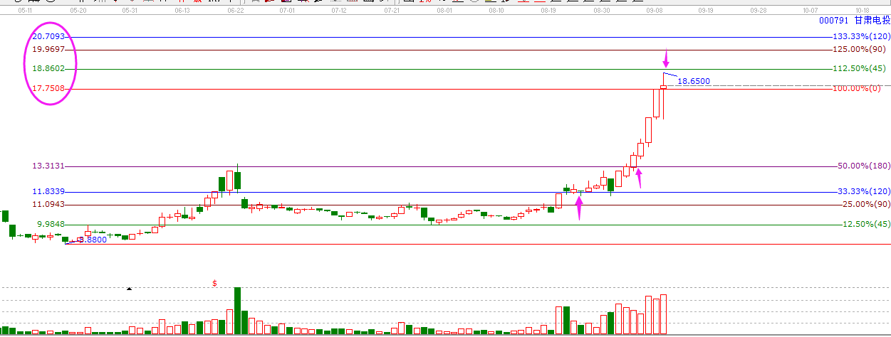 江恩圖形分析:江恩價(jià)格百分比是我們經(jīng)常使用的價(jià)格分析工具,利用百分比,我們可以很輕松的把握到單邊市場(chǎng)的價(jià)格波動(dòng)空間,阻力位以及支撐位,有效的輔助我們做好持股和交易。買在支撐位,賣在阻力位。突破一線看高一線。按照百分比的操作規(guī)則,在8月24日,個(gè)股甘肅電投回踩百分比33.33%的支撐位,按照買在支撐位的規(guī)則,形成了買點(diǎn)。