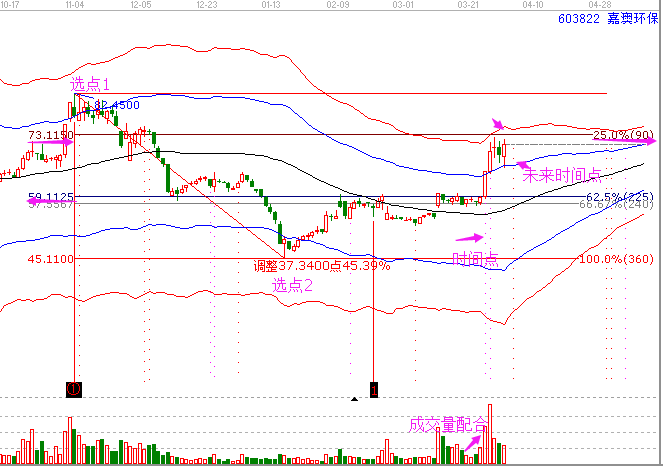 在我們深入了解上面的圖形前,我們來簡單了解一下什么時間跟的時價共振。時間和價格的關(guān)系是江恩理論研究的一對經(jīng)典關(guān)系。時價共振是指當(dāng)價格到達(dá)重要重要的位置(壓力或者支撐),時間窗口到來,確定我們買入或者賣出的操作。下面我們來看上圖中嘉澳環(huán)保603822的走勢。買入的時候股價遇到了江恩波段百分比225度位置支撐,下面的虛線是時間工具江恩輪中輪變盤點,整好是買入的那天為時間變盤點,這都成就了這個買入的操作,當(dāng)然也收獲了到利潤。下面我們來看嘉澳環(huán)保的完整圖形。