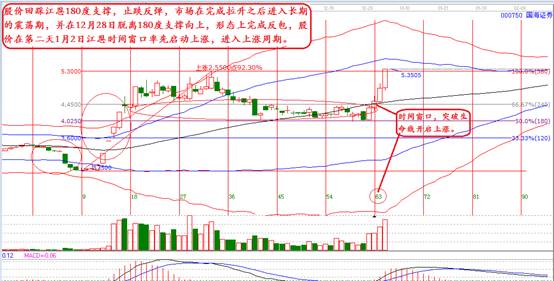 國海證券股價回踩江恩180度支撐之后止跌反彈,股價在完成拉升第一波之后進入長期的橫盤震蕩期,并在12月28日脫離180度支撐向上,形態(tài)上完成反包,股價在第二天1月2日江恩時間窗口率先啟動上漲,進入上漲周期。