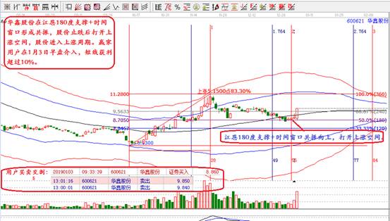 華鑫股份在江恩180度支撐+時間窗口形成共振,股價止跌后打開上漲空間,股價進入上漲周期。贏家用戶在1月3日早盤介入,短線獲利超過10%。