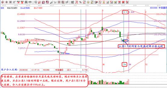 中信建投,在零度價格循環(huán)位及藍色線見頂回落,隨后回踩至江恩零度支撐,并在江恩1.5倍時間窗口止跌,隨后反彈,贏家用戶在時間點止跌后1月2日介入,該股短線上漲15%以上。