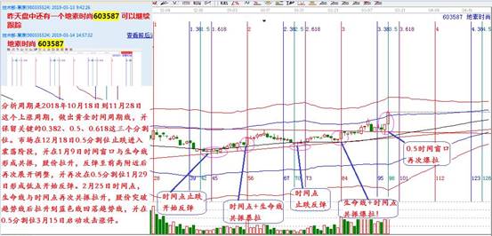 分析工具是江恩黃金時間周期線與極反通道,輔助趨勢線做圖。筆者選取的分析周期是2018年10月18日到11月28日這個上漲周期,做出黃金時間周期線,并保留關(guān)鍵的0.382、0.5、0.618這三個分割位。市場在12月18日0.5分割位止跌進(jìn)入震蕩階段,并在1月9日時間窗口與生命線形成共振,股價拉升,反彈至前高附近后再次展開調(diào)整,并再次在0.5分割位1月29日形成低點開始反彈。2月25日時間點,生命線與時間點再次共振拉升,股價突破趨勢線后拉升到藍(lán)色線回落趨勢線,并在0.5分割位3月15日啟動攻擊漲停。