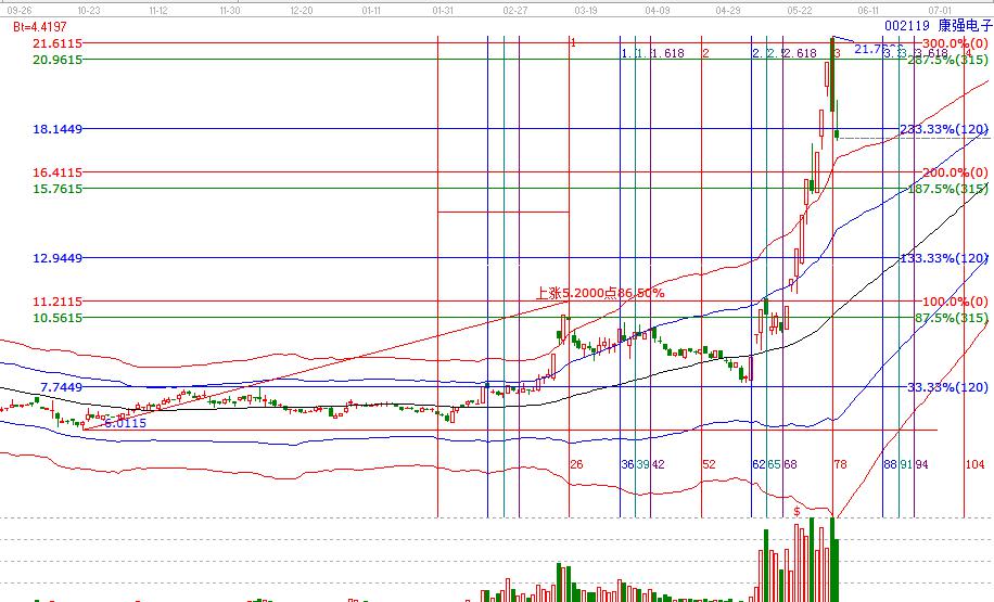 康強(qiáng)電子就是一個(gè)完美的時(shí)間周期操作案例。5月17號,贏家江恩依據(jù)選股模型選出,并介入。