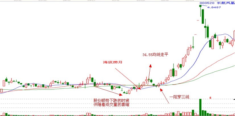 二:13日均線隨成交量的穩(wěn)步放大,股價(jià)穩(wěn)步攀升,13日線重新上穿55均線,這個(gè)過程就是海底撈月。