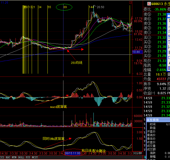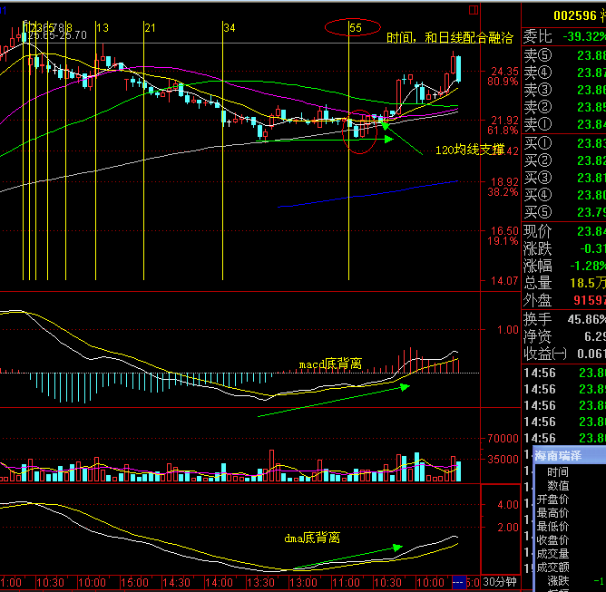 第四:30分鐘的回調(diào),形成底背離,出現(xiàn)明顯的底部組合形態(tài),(a:2—3段的背離,dma同時(shí)也出現(xiàn)背離,成功率更高),(b:筑底時(shí)間同樣符合費(fèi)氏時(shí)間,而且和日線配合融洽)